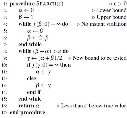 We know \overline{n} > 0(\underline{n} > 0), but we do not know an upper bound. We therefore perform a one-sided binary search to find an upper bound. Once we have an upper bound, we use it together with the greatest lower bound in a binary search procedure to find \overline{n}(\underline{n}) to arbitrary precision \varepsilon; the details of this procedure for estimating \overline{n} are laid out in Algorithm 1. The procedure for \underline{n} is similar, but with f(\cdot,0) replaced with g(\cdot,0)=f(-\cdot,0).