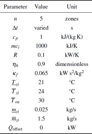 Let T_{z}Tz denote the vector of building zone temperatures, and let \dot{m}_{z}˙mz denote the vector of mass flow rates of cooled air into each zone. Also, let d_{r}dr denote the fraction of return air that is recycled into the system, and let T_{c}Tc be the cooling coil outlet air temperature. Additionally let \dot{Q}_{\text{offset}}˙Qoffset be the vector of thermal loads independent of zone temperatures. Then, the dynamics of the system can be described by \begin{align*} M\frac{d}{dt}T_{z}(t)=&RT_{z}(t)+\dot{Q}_{\text{offset}}(t)\\ &+c_{p}\dot{m}_{z}(t).^{*}(1\!\!1 T_{c}(t)-T_{z}(t)), {\tag{1}} \end{align*}MddtTz(t)=RTz(t)+˙Qoffset(t)+cp˙mz(t).∗(11Tc(t)−Tz(t)),(1) where 1\!\!1=[1,\ \ldots,\ 1]^{T},.^{*}11=[1, …, 1]T,.∗ denotes an elementwise product, MM is a diagonal matrix of thermal capacitances associated with each building zone, RR is a matrix of thermal resistances associated with each building zone, and c_{p}cp is the specific heat capacity of air.