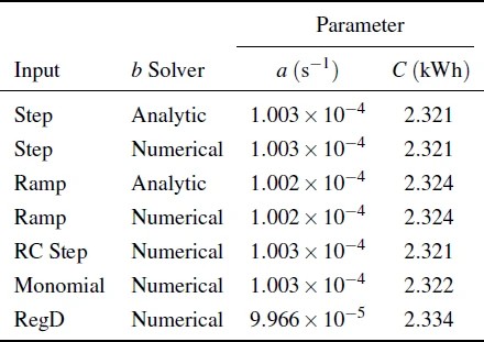 There are a number of issues we are planning to further develop in our future work. First, we believe the proposed identification technique is quite general; thus, we plan to test the performance of our procedure on additional types of systems, including those the exact dynamics of which are unknown, but may be inferred from historical data. Another issue worth exploring is relaxing the assumption that all parameters, including ambient air temperature and acceptable comfort temperature ranges, are constant in time. Further research could examine how time varying system parameters affect battery parameters. Additionally, we could test how quickly the identification procedure can detect these changes. Finally, in our procedure, we initialize our system with zero initial charge. If this were not the case, we would likely want to determine up and down capacities separately. The current charge would be difference from the midpoint of the up and down capacities.