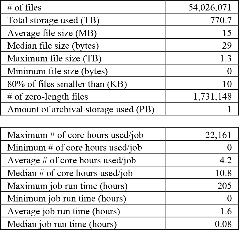 To understand how to optimize our configuration for our actual computational and data needs, we performed a rigorous data collection and an analysis of our workload. We also had anecdotal experience that informed our analysis. After the first year, we collected the usage statistics shown in Table 1. We were surprised by the sheer number of files, the tiny size of the vast majority of them, and the short job run time. We also experienced unexpected issues with scheduling and the file system due to unpredicted use cases. This workload is vastly different than a typical HPC workload where there may be only a couple of jobs using all of the system's cores and writing to only a few files [49]–[53].