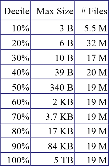 In a typical month during 2013, there were approximately 160 million files less than 20 kilobytes in size consuming 300 gigabytes, and 30 million files greater than 20 kilobytes in size consuming 1,000 terabytes. For the files smaller than 20 kilobytes, about 100 million files were of zero length. 50% of the files for the genomics workload were 29 bytes or smaller and 80% of the files were smaller than 10 kilobytes. Files in the larger category were unremarkably distributed. The largest file was 1.3 terabytes. 93 million out of 200 million files were less than 1 kilobyte and consumed 0.007% of the total disk space in aggregate. All files less than 1 megabyte consumed only 1 terabyte in aggregate. Nine million out of 18 million directories only contained one file. Upwards of 5,500 directories had greater than 10,000 files in them, with several exceeding 500,000 files. Although the GATK -Queue control process has an option to clean up intermediate files automatically when the pipeline has completed successfully, it appeared that not all files were removed.