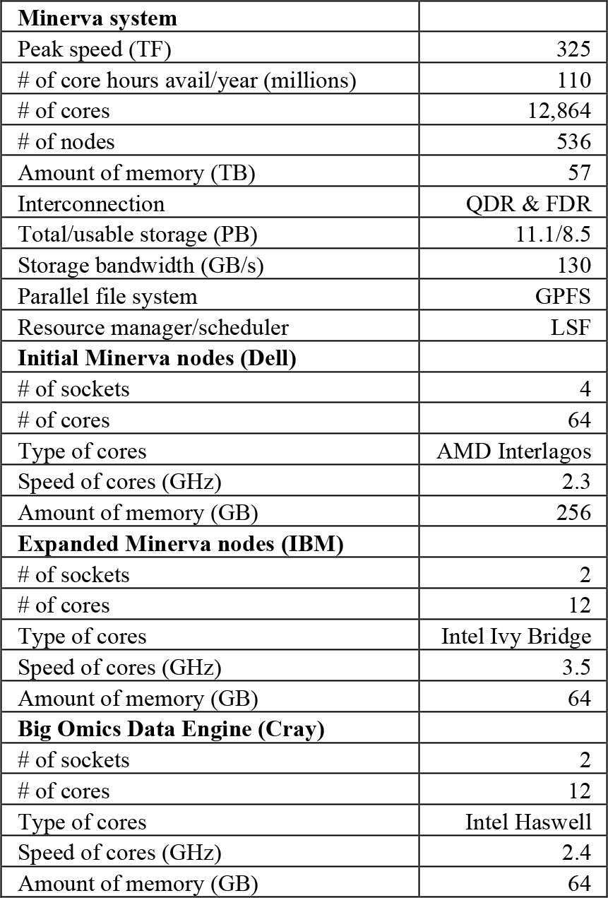 Our overarching goal was to accelerate scientific discovery by (1) providing a stable and reliable platform with repeatable performance, (2) increasing to the maximal affordable size of storage to accommodate future growth, (3) improving the computational throughput through a tuned architecture, and (4) employing the best new technologies to boost our overall throughput. We selected our new design by reviewing our previous system performance in the context of our users' application performance and projected usage. In section 4, we discussed the workflow and requirements for the scheduler and in section 5, we explored the projected compute and storage usage along with the results of our benchmarking as discussed in section 6. We then architected a system to meet a combination of the expected and actual user requirements using a selection of new technologies. We expanded Minerva in two phases: first in February 2014 funded by Mount Sinai, and the second in February 2015 funded by the NIH to build a Big Omics Data Engine (BODE). In the first expansion, we added 2,508 Intel Ivy Bridge compute cores, 160 terabytes of flash and 3 petabytes of IBM GSS storage. In the second expansion, we added an additional 2,484 Intel Haswell compute cores and 5 petabytes of DDN storage. The aggregate configuration is displayed in Table 3. The main interconnect for the cluster is Infiniband with both Quad Data Rate (QDR) and Fourteen Data Rate (FDR) connections between the nodes depending on their age.