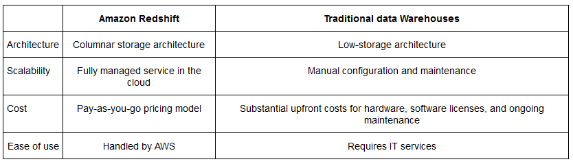 Amazon Redshift and traditional data warehouses significantly differ in architecture, scalability, cost, and ease of use.